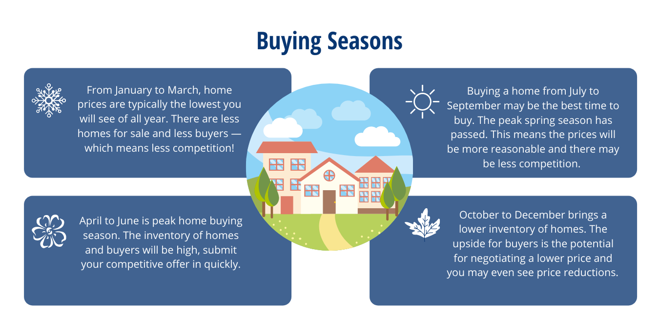 Conventional wisdom says to buy during the peak seasons of spring and summer, when there may be more options. But that also translates into more competition and potentially higher prices. That’s why you shouldn’t neglect fall and winter for home shopping, especially if the other conditions above line up.