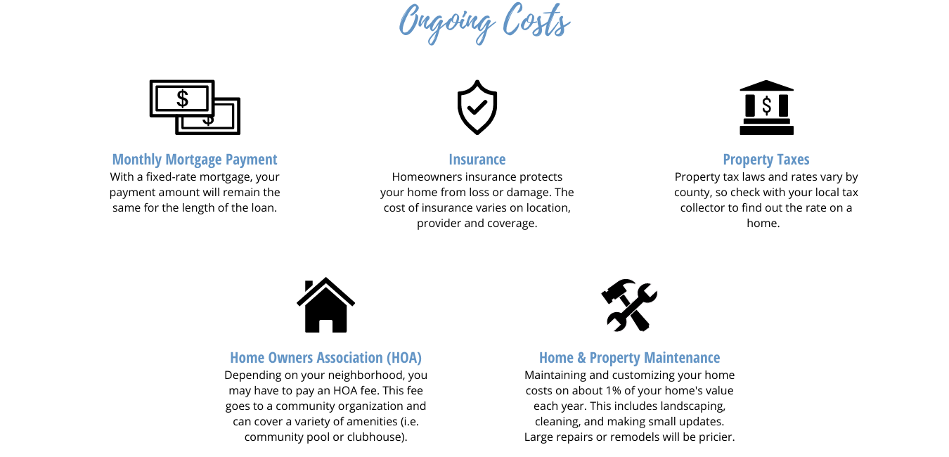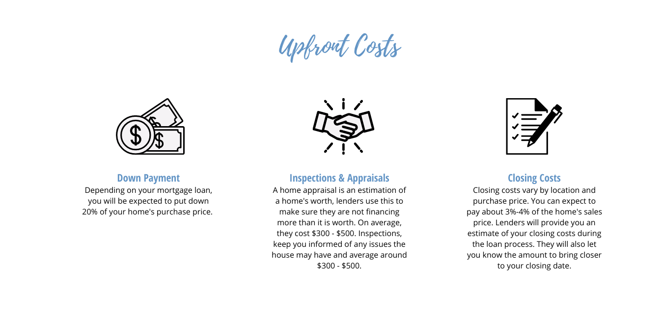 Most buyers are aware of the obvious costs of buying a home: a down payment and a mortgage. But, what about the unexpected costs? There are, in fact, several costs both upfront and ongoing that buyers should anticipate. It is important to consider all of the costs before purchasing your home.