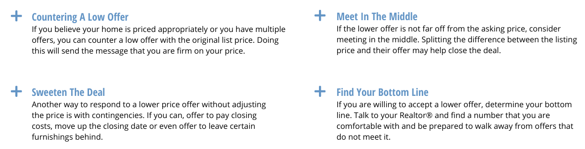 It’s possible you may be faced with multiple competing offers to purchase your property. Your REALTOR® can explain various negotiating strategies for you to consider. If you have questions about the possibility of multiple offers and the way they can be dealt with, ask your REALTOR® to explain your options and alternatives. Here are some basics to get you started: